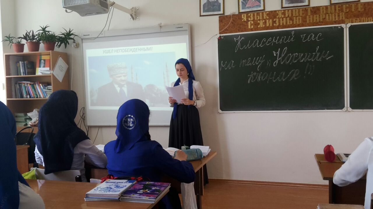«10 мая – День памяти и скорби Первого Президента Чеченской Республики А-Х.А.Кадырова». На классных часах были продемонстрированы фото и отрывки из жизни Первого Президента ЧР, Героя России А-Х. Кадырова. Проведены уроки мужества, посвященные памяти Первого Президента ЧР, героя России А-Х. Кадырова.